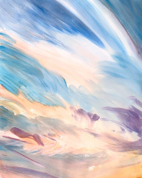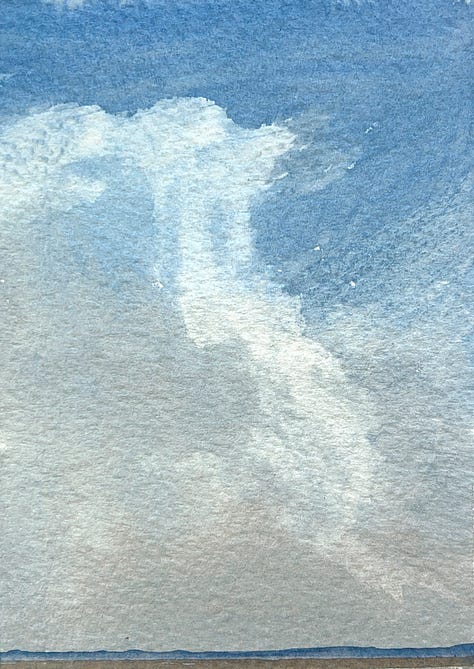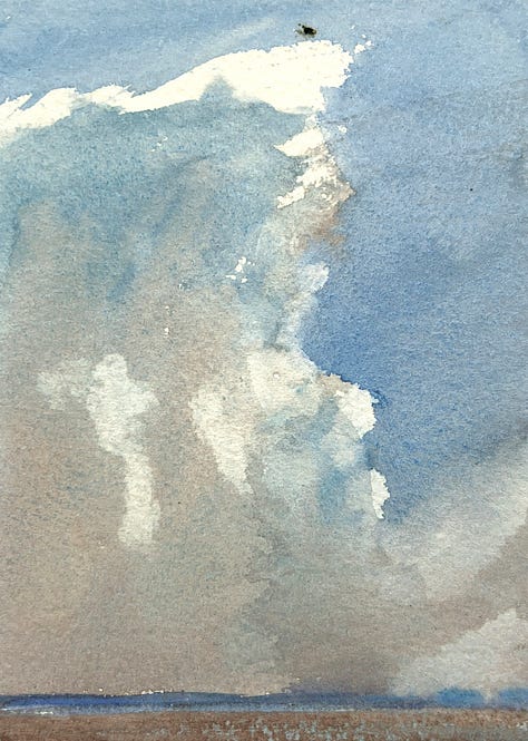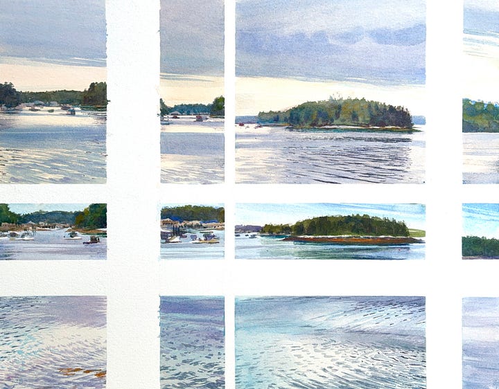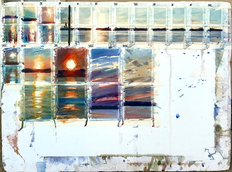 The reason to make work this way: I had already been working in multiples, 15 or 20 or 30 paintings within one session, but once separated from the board, difficult to read by the audience as more or less one work of art. Their effect in individual reception was still powerful, but so much more so when seen all together, understood as a single afternoon, an honest representation of changing light and advancing time. So, what is the solution? To just make them all on the same sheet of paper, one work, many views, many smaller paintings within one work of art.