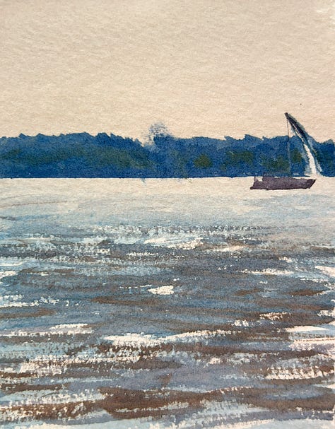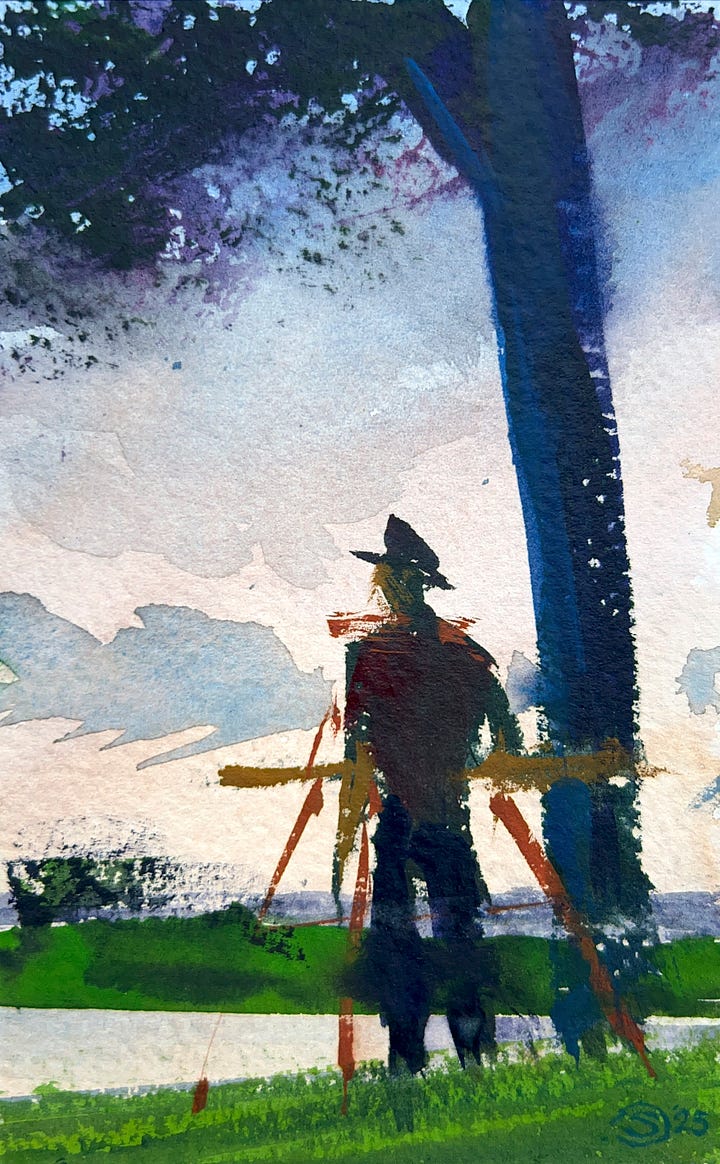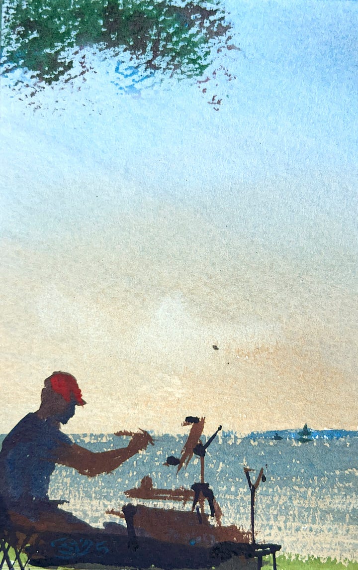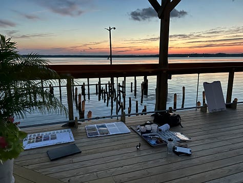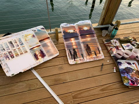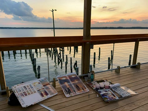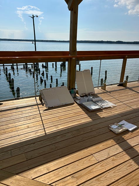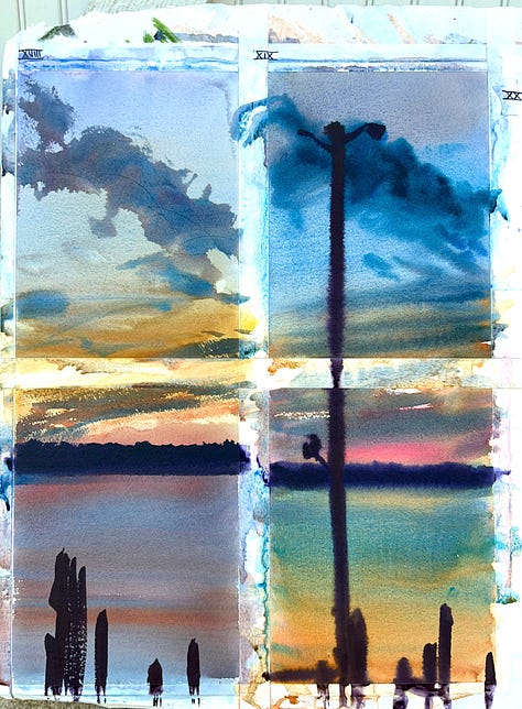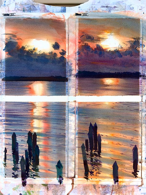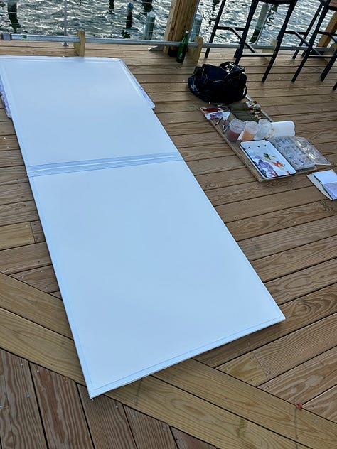 Even as early as last year when I was in Easton, I’d had in mind a large-scale piece of the Cormorants perched on the piers over the water by Doc’s Sunset Grille in Oxford, MD. It was the first scene I sketched upon arrival in 2024, but a painting of the scene did not materialize. For Easton 2025, each artist is allowed two “competition” pieces to submit for pageantry. I knew as early as last year I wanted to do a diptych of the cormorants at Doc’s, that was the vision. I also had a proven working method from Big Sky of making many, many small works at once, a process which allows me to try many ideas and to absorb the benefits of voluminous practice. When I asked the Easton organizers about submitting two pieces both of the maximum allowable dimensions (40 x 50” on the outside of the frame) I was cautioned that the pieces would have to be vertically displayed, stacked one above the other, with the frames touching. Perfect! I knew the format I needed to practice for the submission of the final two works - a large-scale diptych in watercolor, both pieces 40 x 50”, with a combined dimension of a 40 x 100” image. I’d never worked that large in plein air watercolor before (only up to 40 x 60”), and actually had never heard of or met anyone who had. Just because it hasn’t been done before doesn't mean it can’t be done. Plus, it was technically within the rules. I knew it would be extremely challenging, but as I saw it, I had a week or so to practice the format, a vertical diptych, one image bisected horizontally with a 2 to 5 ratio (40 to 100).