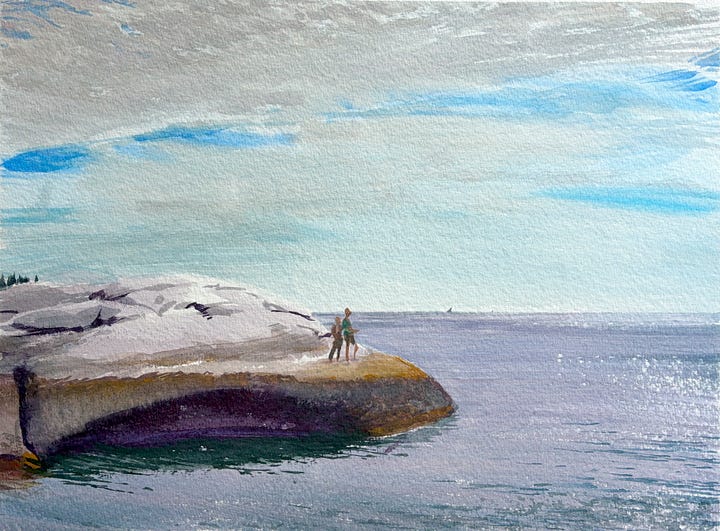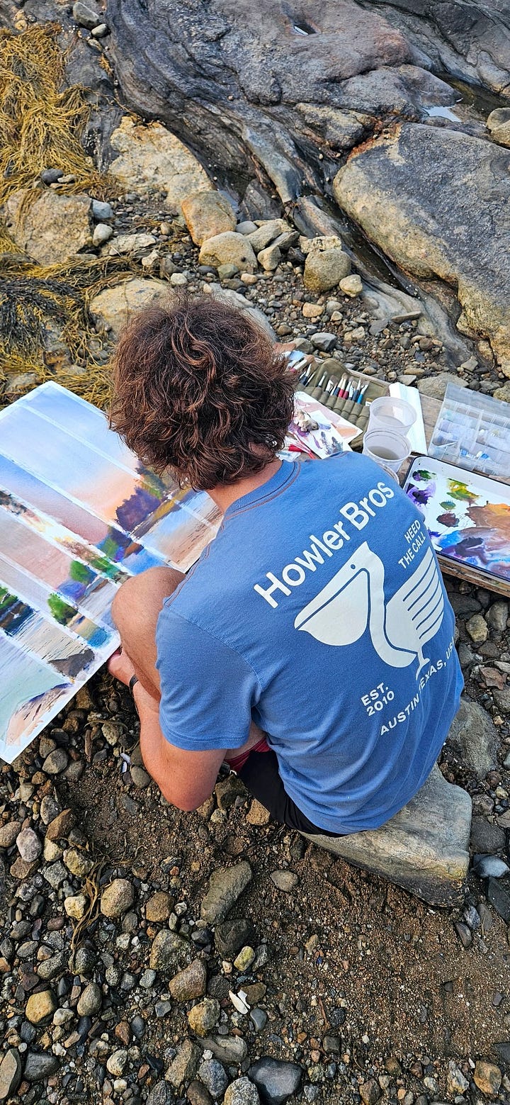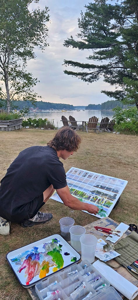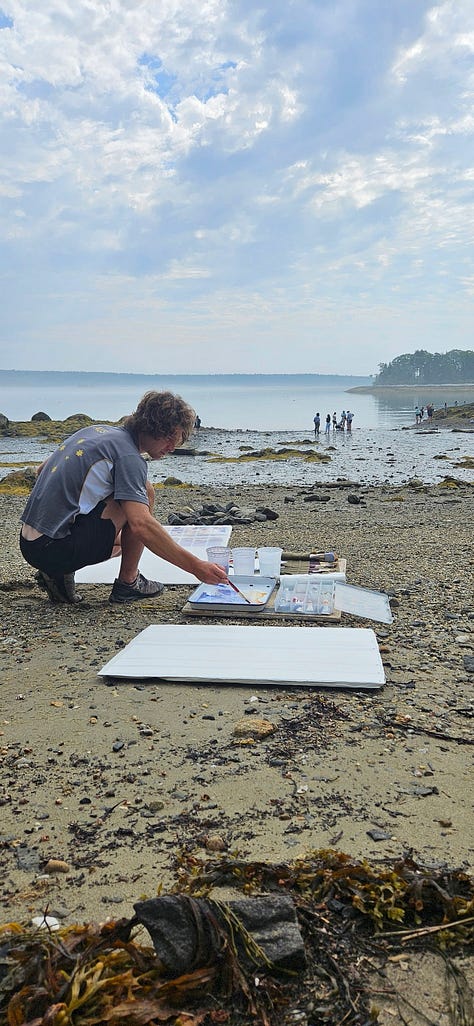 Hog Island, which in essence turns into a camp for adults over the summer months, was spectacular. My initial idea for the Artist Residency of painting 1000 puffins was quickly dismissed, as there are no puffins on Hog Island itself - the Atlantic Puffin is an endangered seabird found a bit further out, and this time of year, barely at all, most of them having already moved out to sea for the season. What Hog Island does have in abundance is a magical amalgamation of rocky shoreline, intertidal wonders, rock weed, saltwater, near and distant islands covered in pine, and spectacular, wondrous, ever-surprising atmospheres and beyond them the sun, the moon, the stars. To look up at night and see the stars - nothing quite like it - but the best part of the island is the people who work and stay there. I could not have hoped for a warmer welcome from an open and gracious group, whether learning about nature journaling from a Maine Master Naturalist or swapping stories of international travel with seasoned exploratory scientists, artists, conservationists, activists.