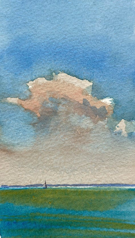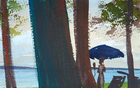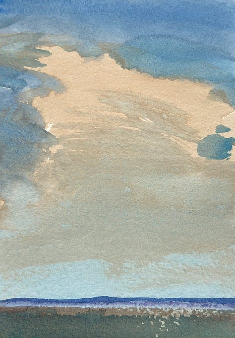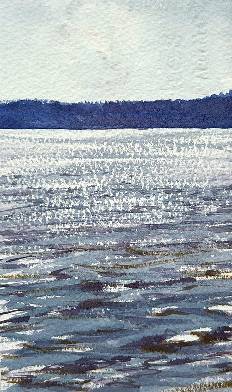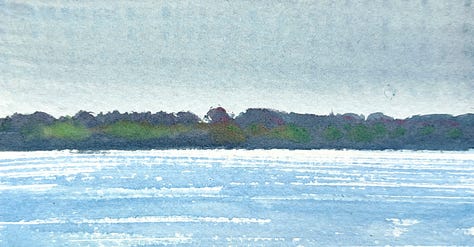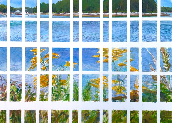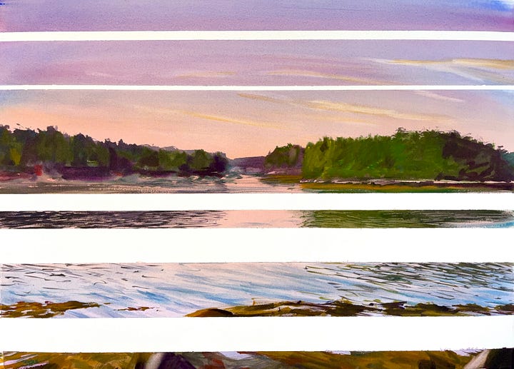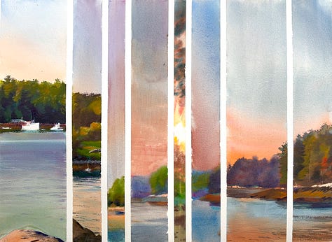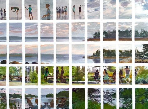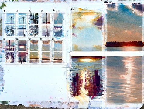 Without necessarily meaning or intending to, almost all the paintings I made were more than just single rectangles within sheets of paper - they are panels, multiples, times of day, changing light, the same or new places painted over and over and over, scenes kept intact as many hours, others cut up into their constituent pieces to be distributed to the other guests and staff of the island.