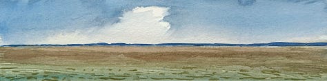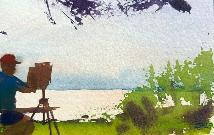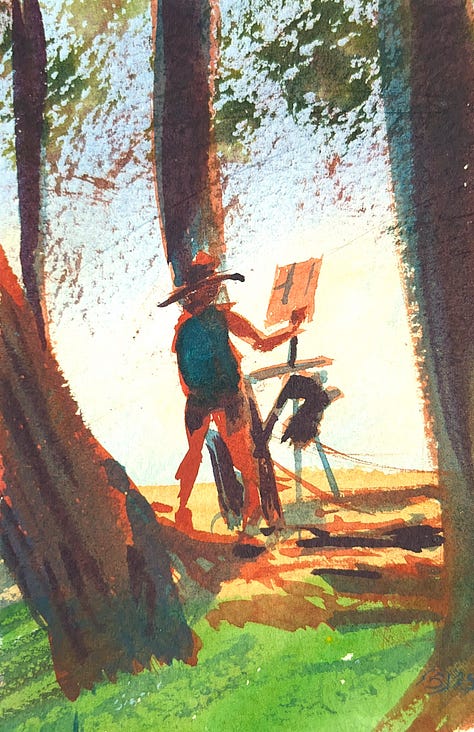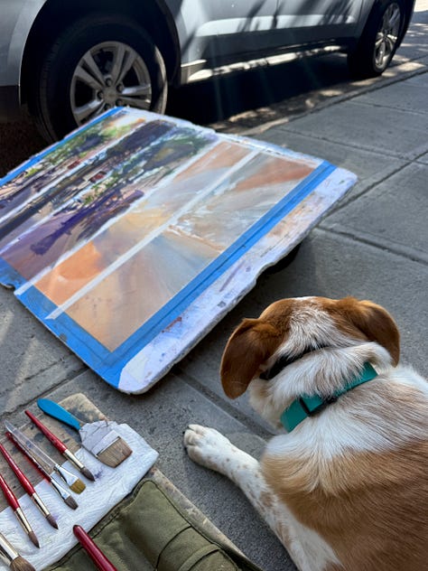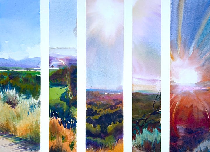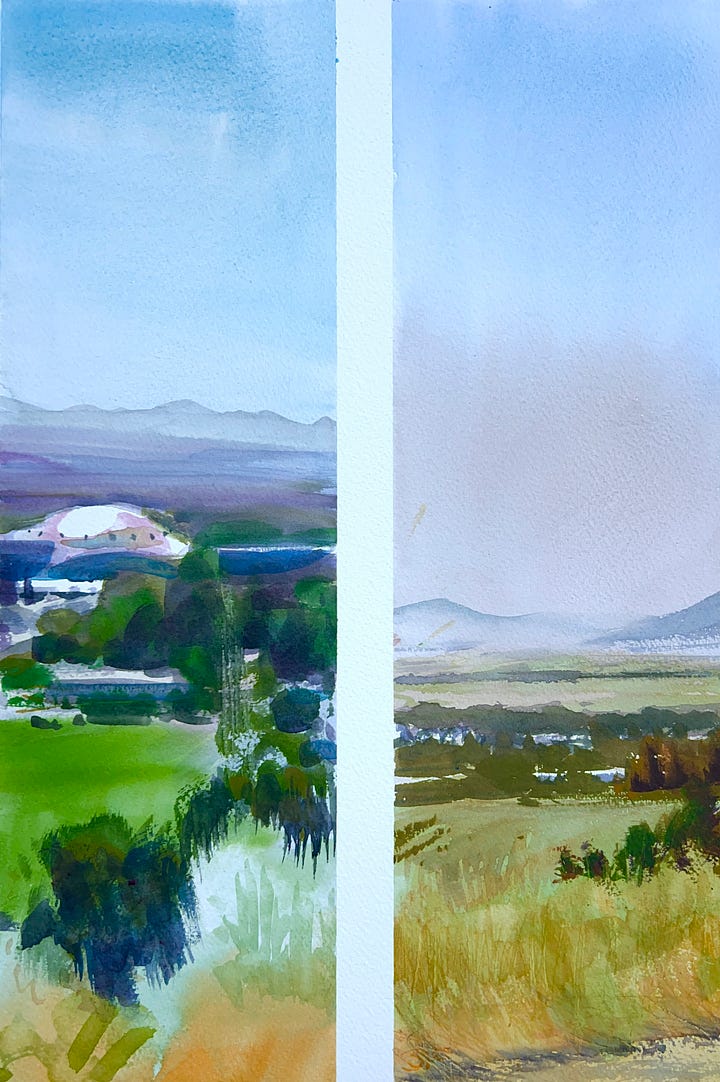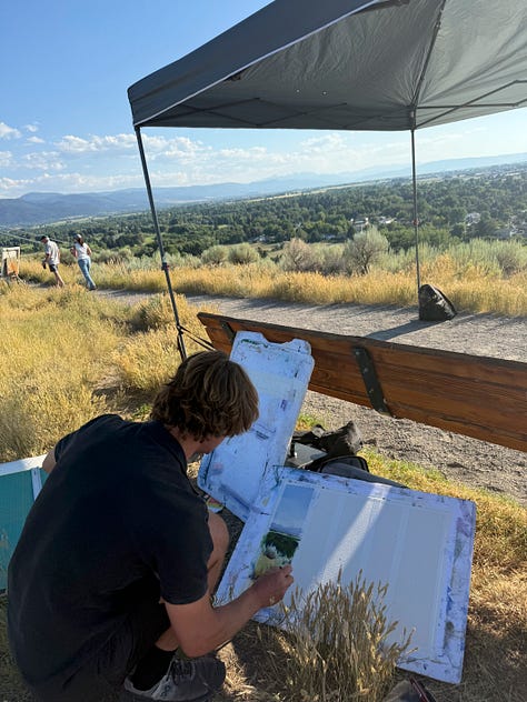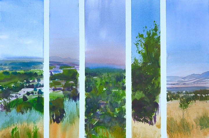 Rather than bask in any kind of afterglow, I accepted the warm words of collectors and fellow artists, and (almost) immediately set out back across the United States. I did spend one extra day in Maryland to breathe - which was wonderful, thank you to those of you in MD who made that possible. I next traveled by car to Bozeman, MT, for Plein Air Montana 2025, the second Plein Air Event I’d be doing for the second time. Although the event had begun on Sunday evening, it took three days to arrive by Wednesday, giving me one day, Thursday, to paint everything I would submit for the competition. As I’d been experimenting already with multiple views and times of day within the same piece of paper during Easton…