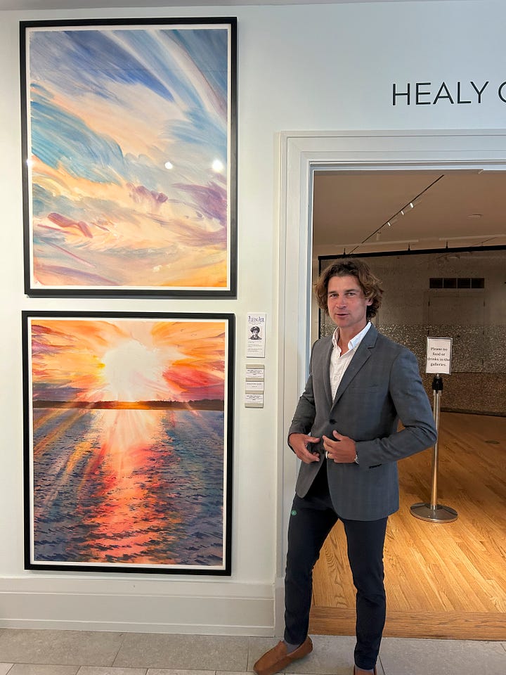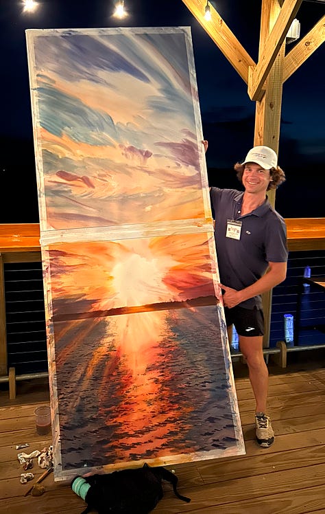 A client purchased a portrait of a boat in Tilghman from last year’s event, another bought my “small painting” on Sunday, and the bottom half of the sunset diptych sold to a collector (I gave her the other half, unwilling to separate the two halves of the work of art). My friend and fellow artist Martin Geiger won the Grande Prize for his work.