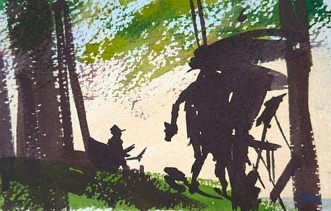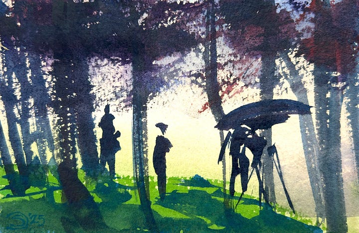 After a beautiful Friday of hiking, including a sun shower and a mellow non-painting evening, the quick draw on Saturday was reinvigorated extension of the same questioning, and I could tell by now, I wanted to push this idea further.