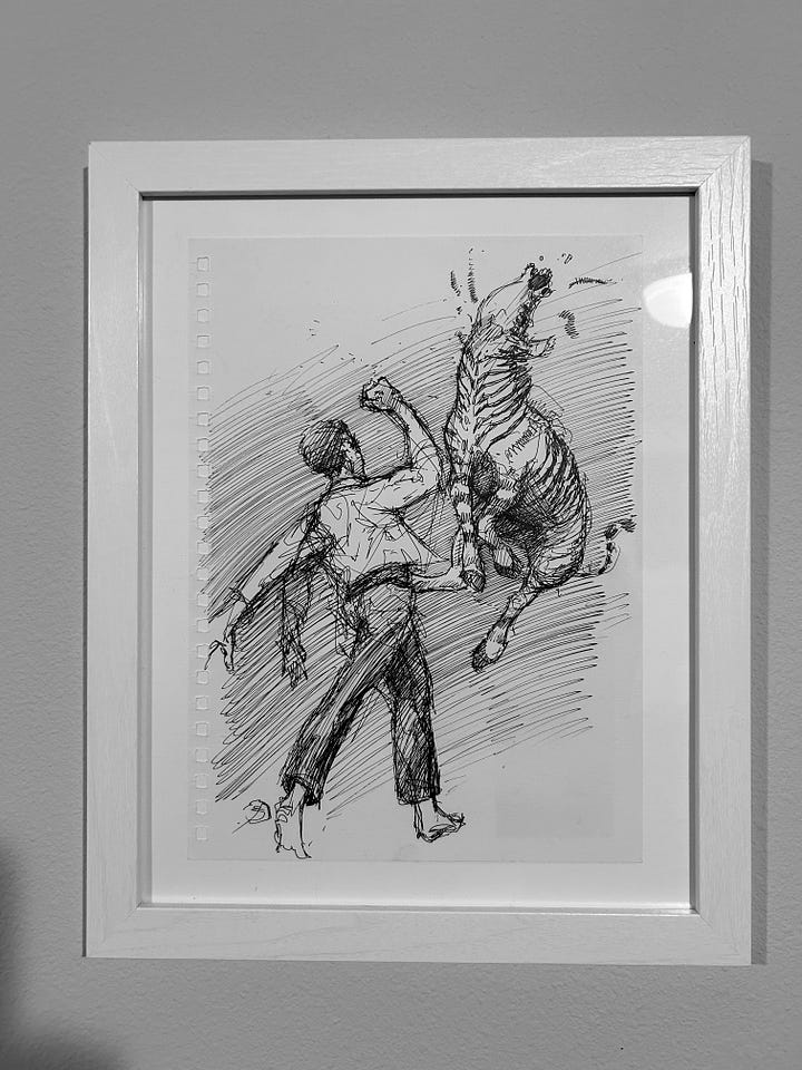 At a Halloween party at said friend’s house, there hung in the Game Cave two pieces I’d made from prompts he’d issued. The first prompt was, “draw me punching a zebra”, and the other, “draw a hipster dragon angry that his beer isn’t hoppy enough.”